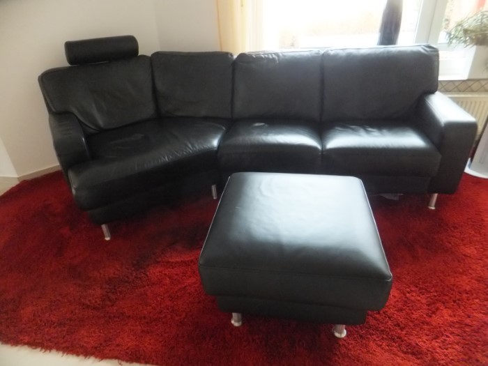 neuwertige sehr bequeme Leder-Eckkombination bestehend aus Zwiesitzer und Trapezelement und Nackenstütze und zusätzlichem Hocker, original LongLife-Leder in schwarz, komplett in Leder auch das Rückenteil, Federkern, verstellbare Metallfüße